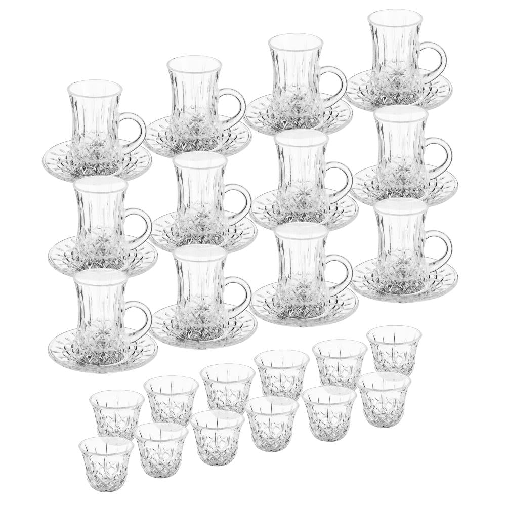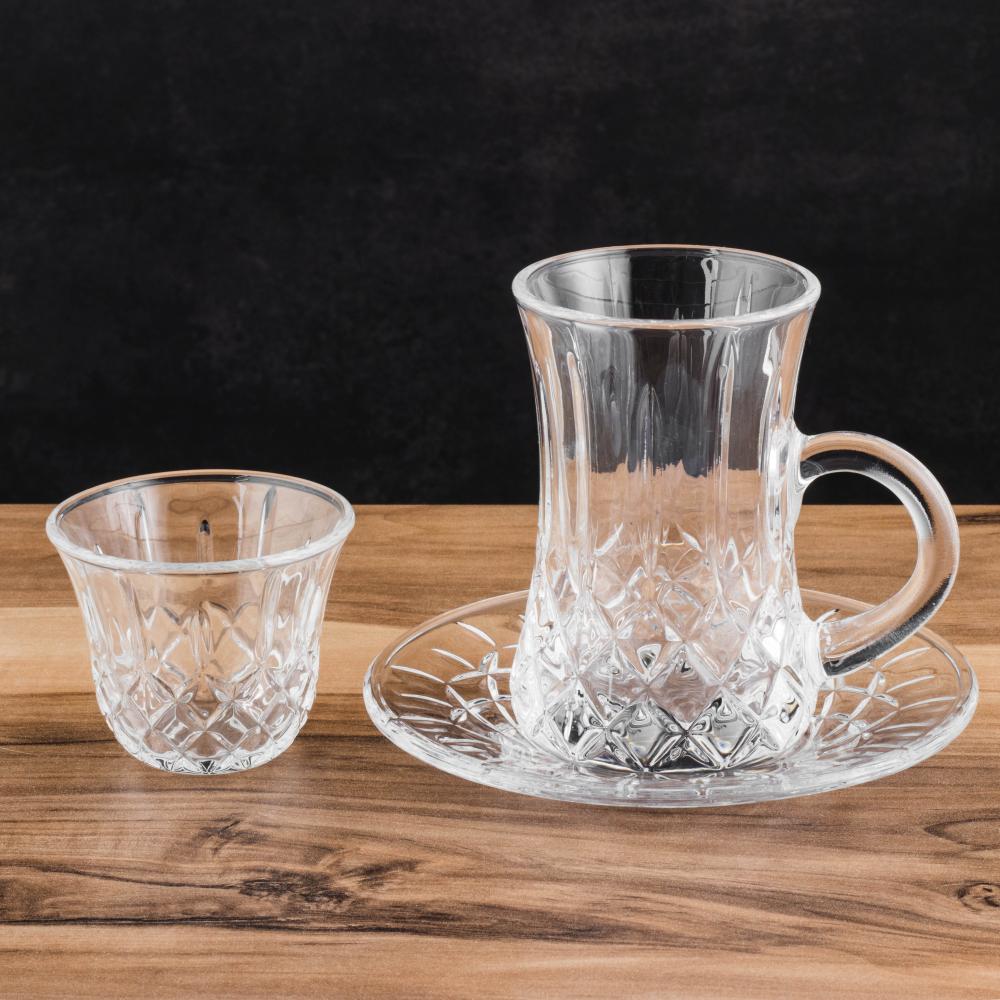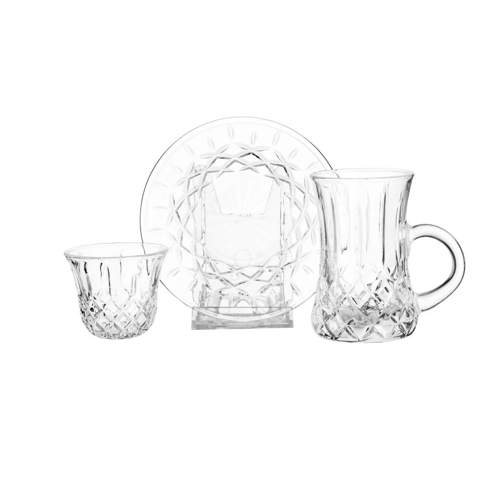يتكوّن من 36 قطعة متكاملة من فناجين الشاي والقهوة بتصميم زجاجي فاخر يعكس الضوء بطريقة تخطف الأنظار.