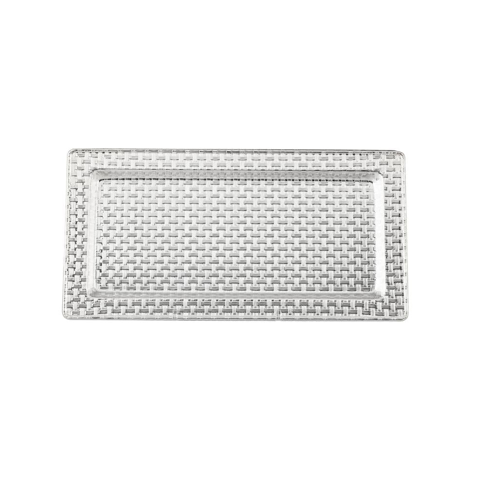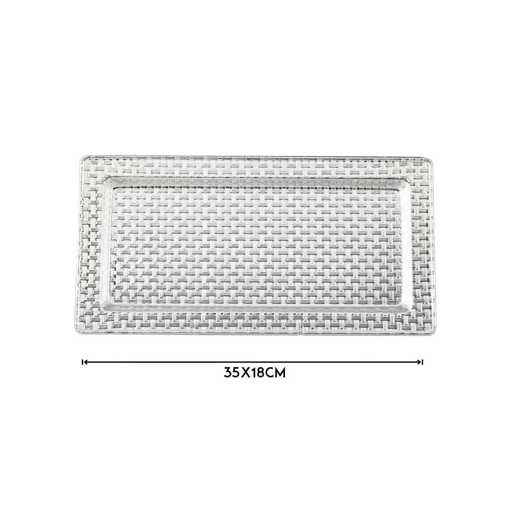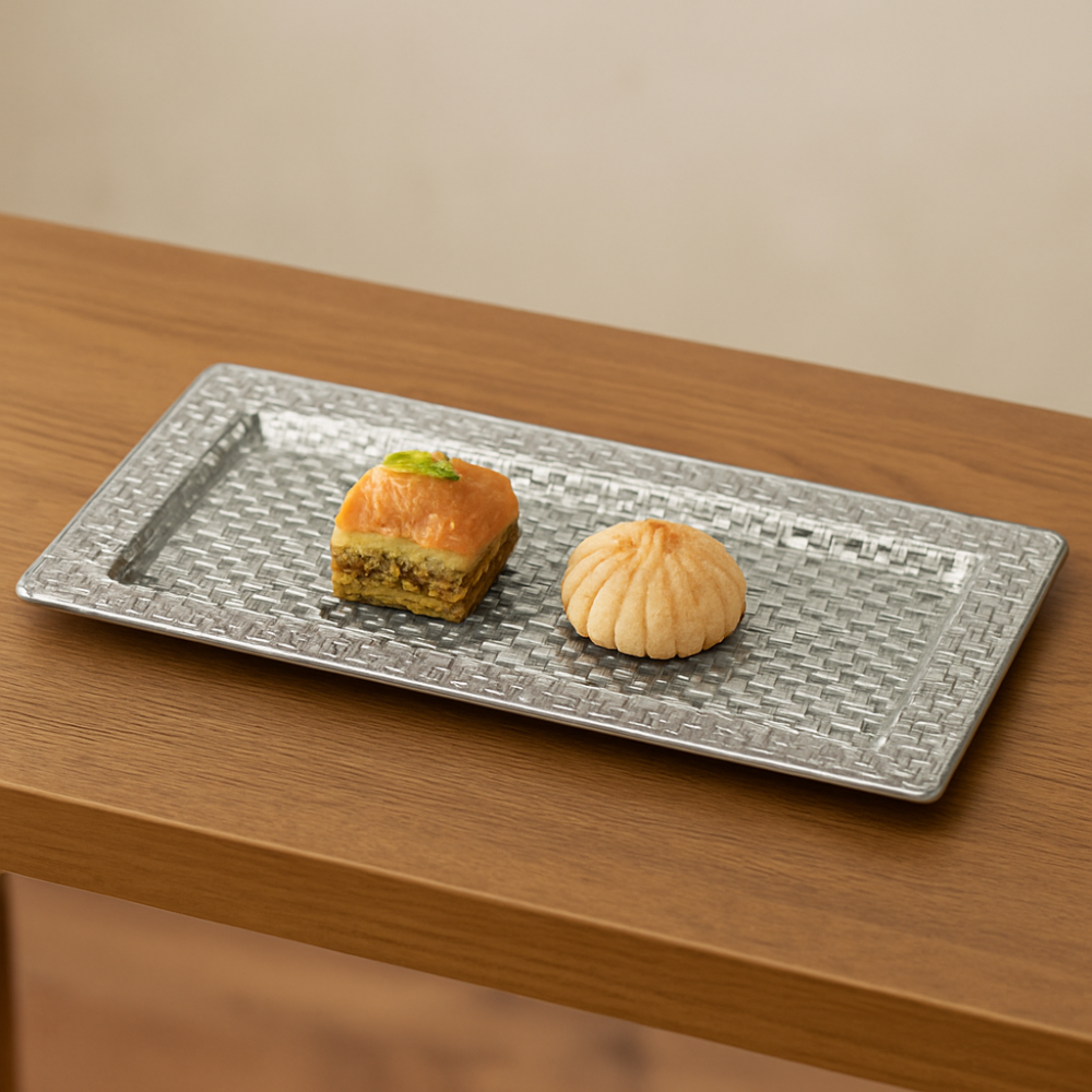 صحن تقديم مستطيل بتصميم معدني فضي فاخر، يجمع بين البريق العصري والرونق الكلاسيكي ليمنح طاولتك لمسة من الرقي والترف.
