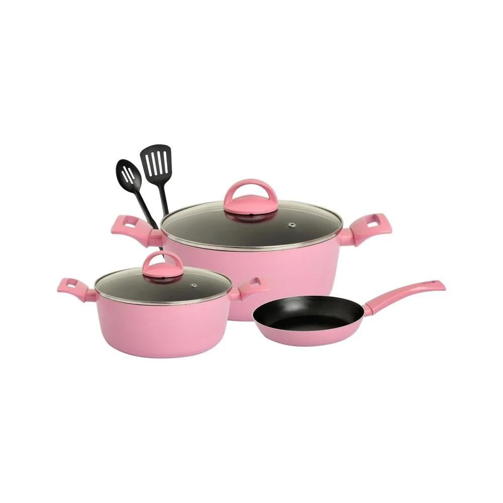 طقم نيوفلون روزقدرمقاس 20-24 سم بغطاء زجاجمقلاة مقاس 24 سمملاعق طبخ 2لون وردي من الخارجبغطاء زجاج عصري