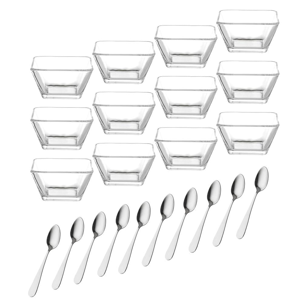 طقم زبادي حلا زجاج شفاف مربع مع ملاعق معدن 24 قطعة 12 شخص