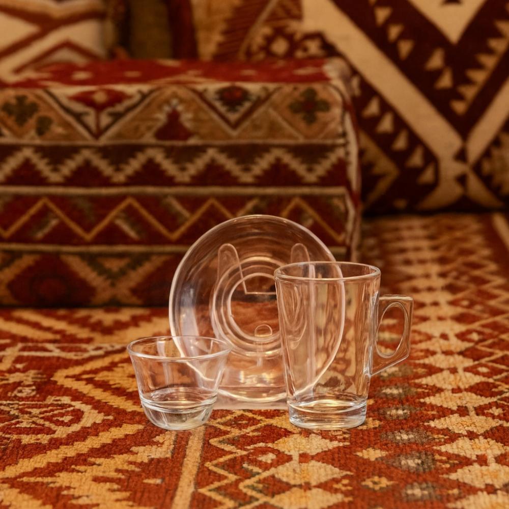 طقم فناجين شاي وقهوة سعودي زجاج شفاف 18 قطعة 145 ملمكونات الطقم:6 فناجين شاي زجاج شفاف سعة 145 مل6 اطباق شاي زجاج شفاف6 فناجين قهوة سعودي زجاج شفاف