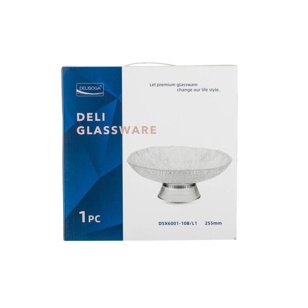 أبهري ضيوفك بلمسة من الرقي مع هذا الطبق الزجاجي المصمم بشكل عصري وجذاب. يتميز بسطح مزخرف يمنحه مظهراً فريداً، وقاعدة ثابتة تضيف لمسة فخامة إلى أي مائدة.