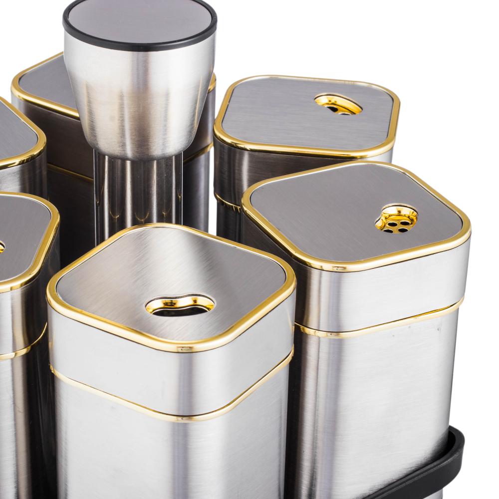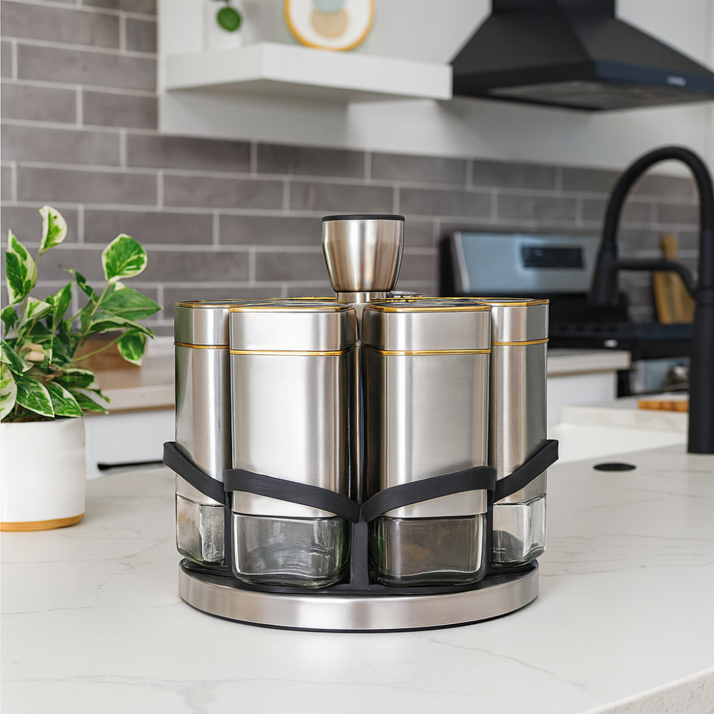 اكتشف أناقة الترتيب وراحة الاستخدام مع علب البهارات والملاحات المصنوعة من الستانلس ستيل والزجاج – طقم فاخر مكون من 6 قطع مع حامل دوّار عملي