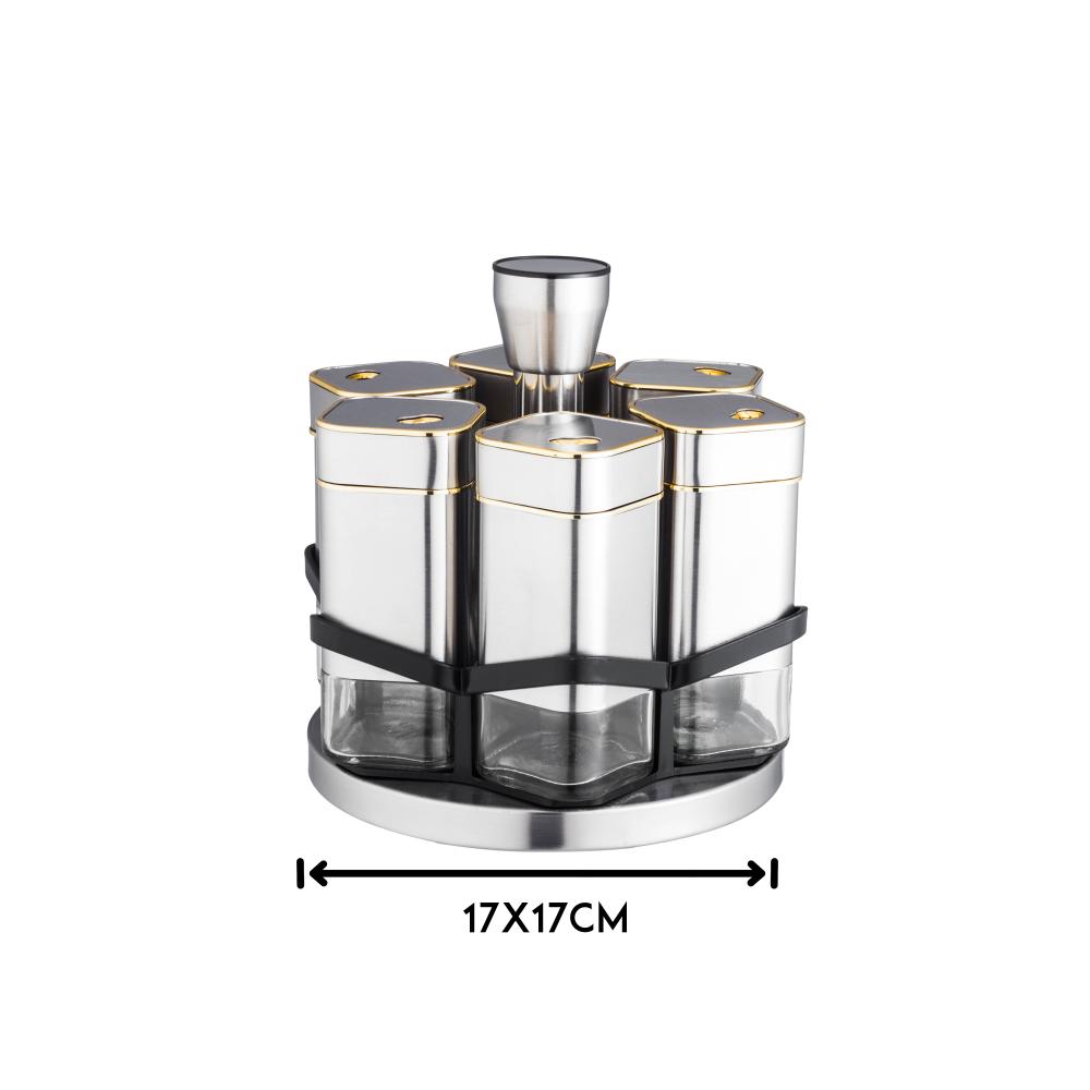 طقم علب بهارات صغيرة زجاج واستيل 6 قطعة مع حامل مدور