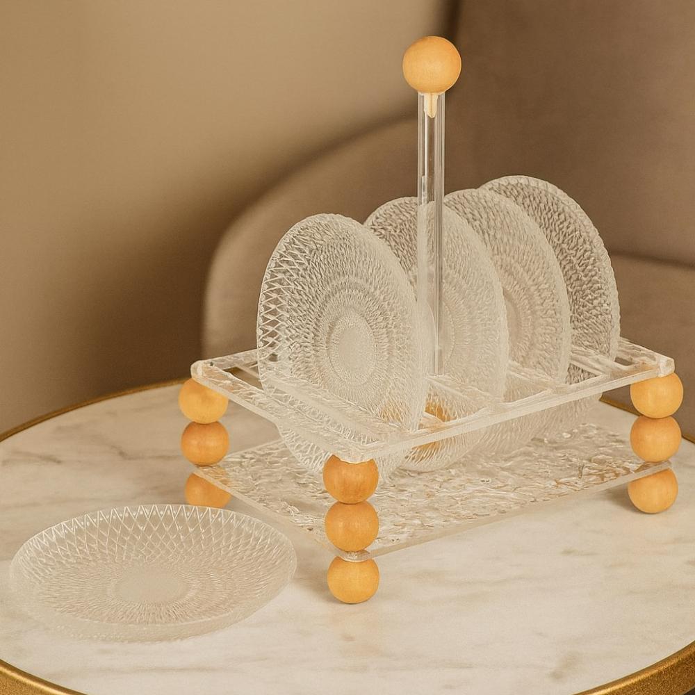 طقم صحون حلى زجاج 6 قطعة مع استاند اكريلك شفاف