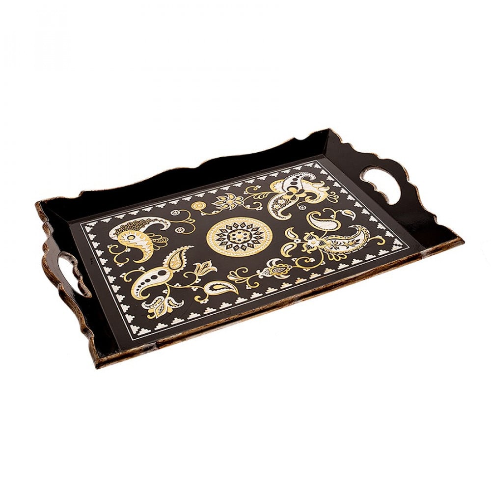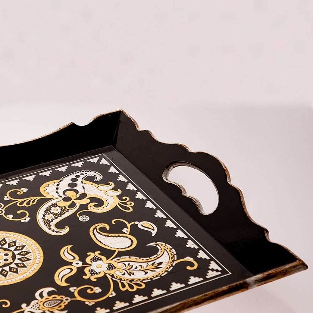 صينية مفردة مستطيلة مصنوعة من الخشب تتميز بزخرفة ذهبية مميزة تعطي لمسة جمالية في التقديم والضيافةمقاس المنتج : 48 × 30 سم