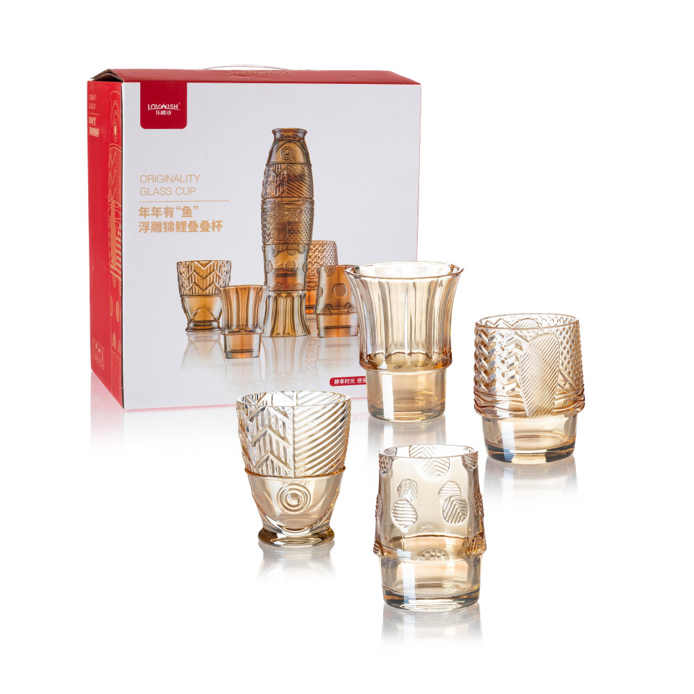 طقم اكواب زجاج 4 قطعباللون العسلي الشفاف تضفي عليها مزيدا" الرونق.يمكن تركيبها لتشكل موديل سمكة ولسهولة الحفظ..السعة7.7 × 10 سم /315 مل8.2 × 10 سم /265 مل8 × 10 سم / 208 مل6.6 × 10 سم /220 مل.