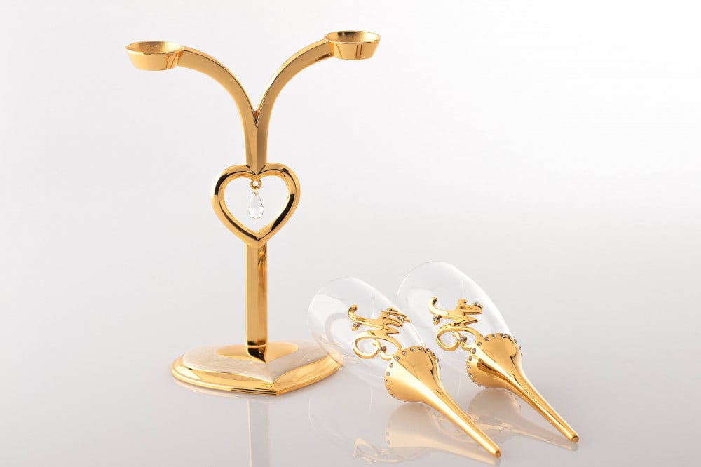 زوج من الكاسات للمناسبات الخاصة تصميم انيق بحامل من المعدن للكاسات وقاعدة تصميم قلب