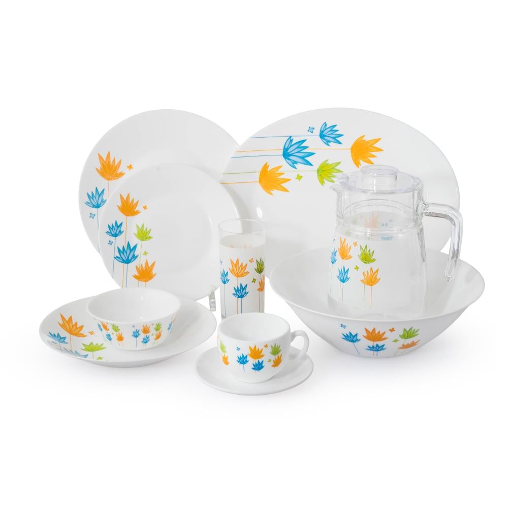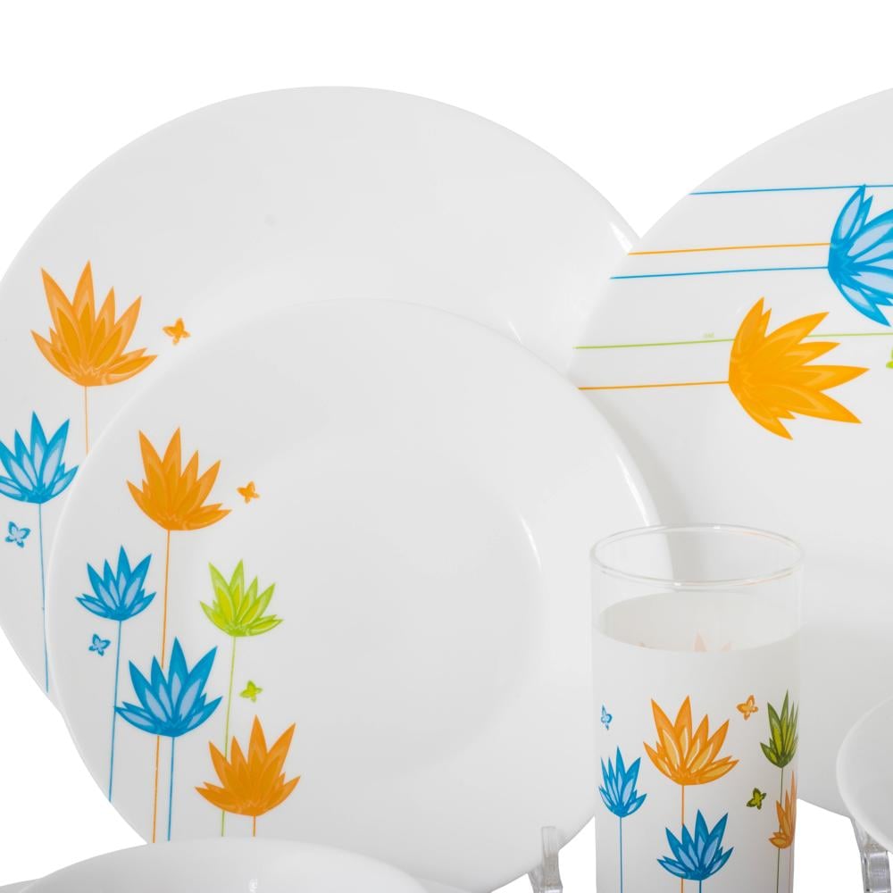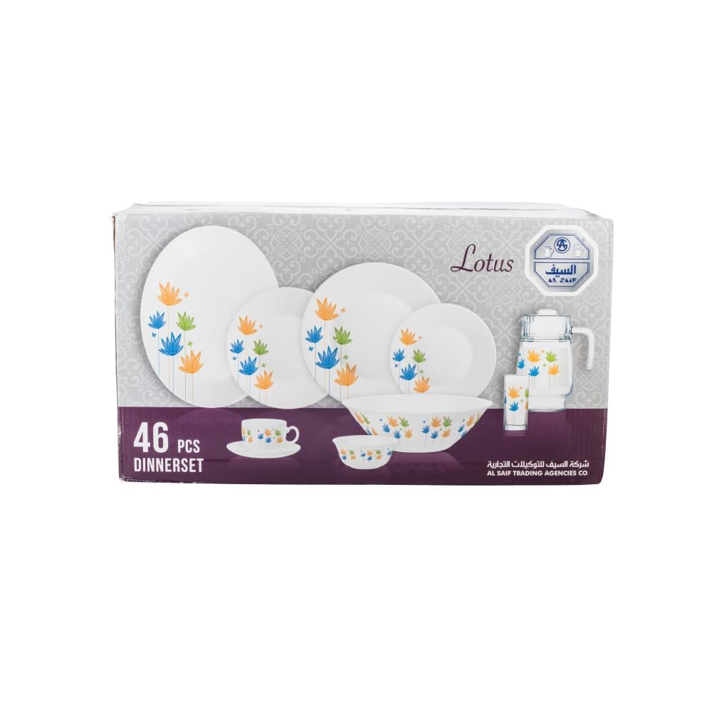 استمتعي بأجواء المائدة الأنيقة مع هذا الطقم المتكامل المكون من 46 قطعة ليكفي حتى 6 اشخاص، بتصميم عصري مزين بنقوش زهور ملونة تضيف لمسة من البهجة والفخامة إلى سفرتك.