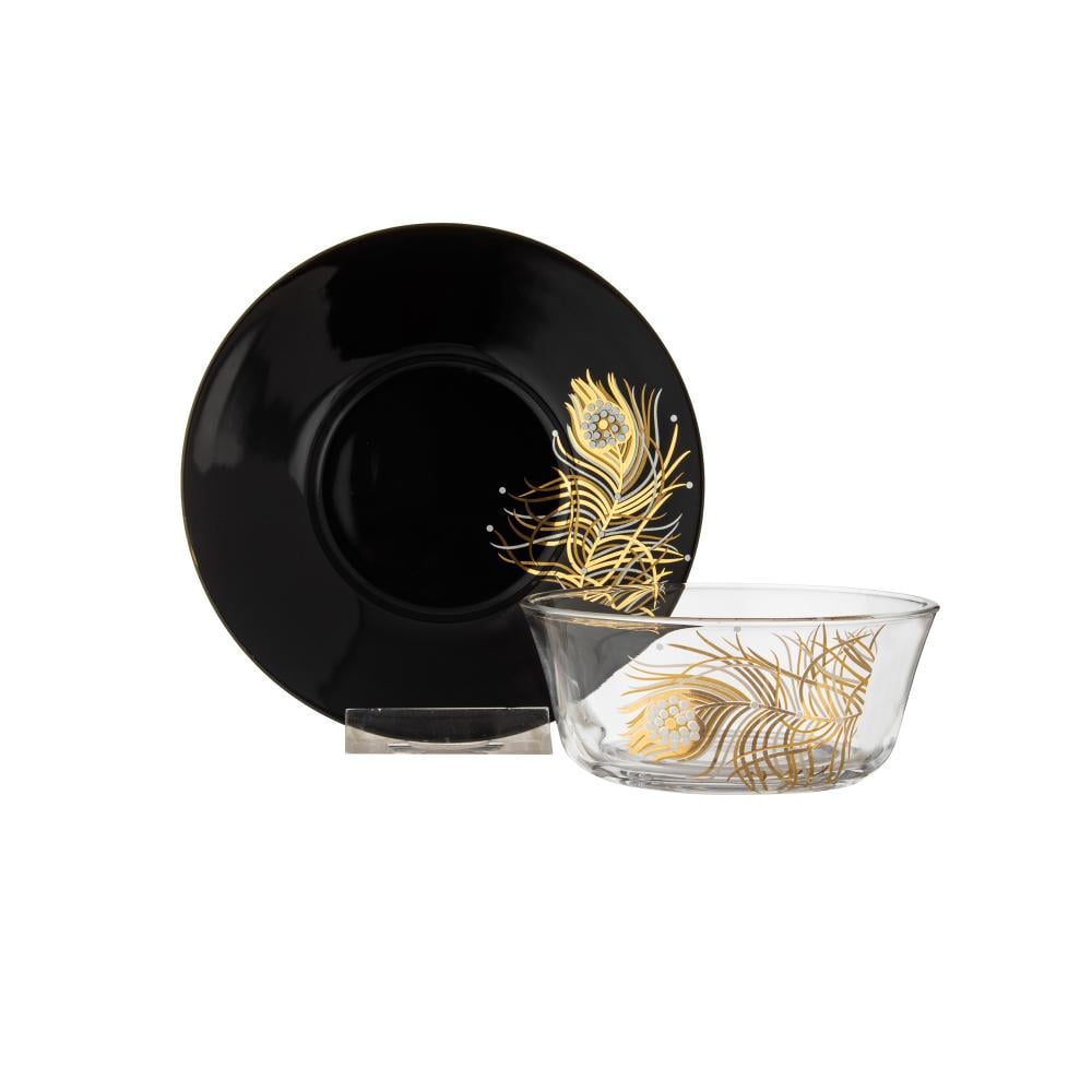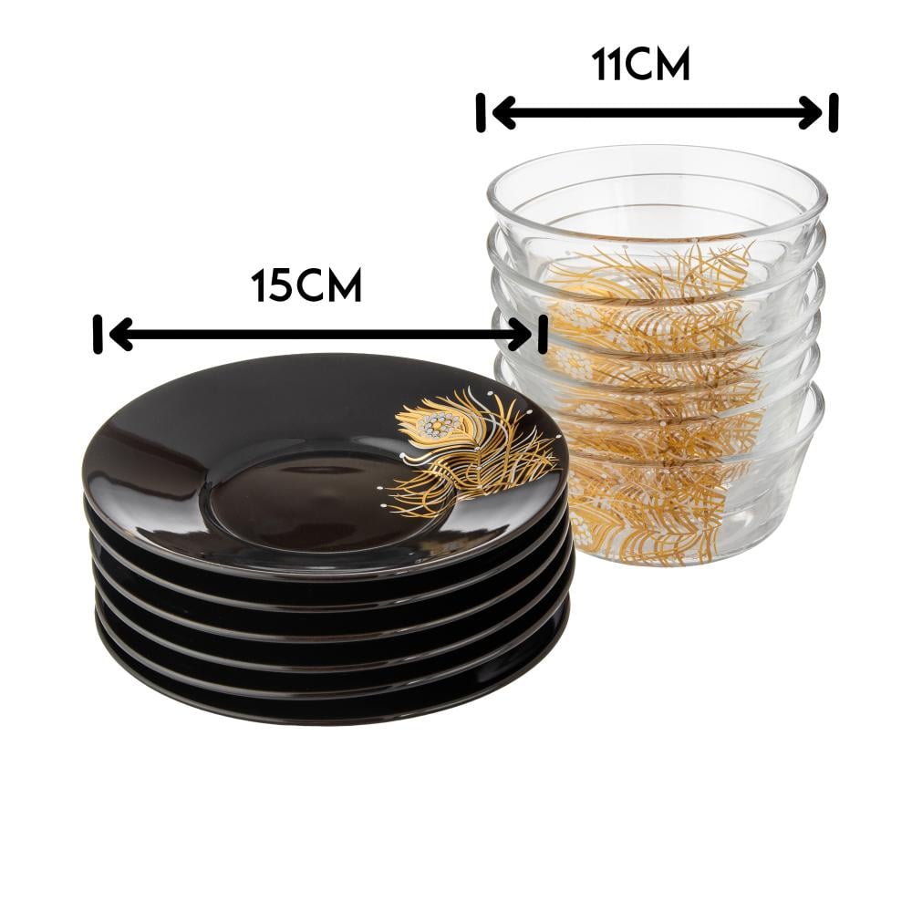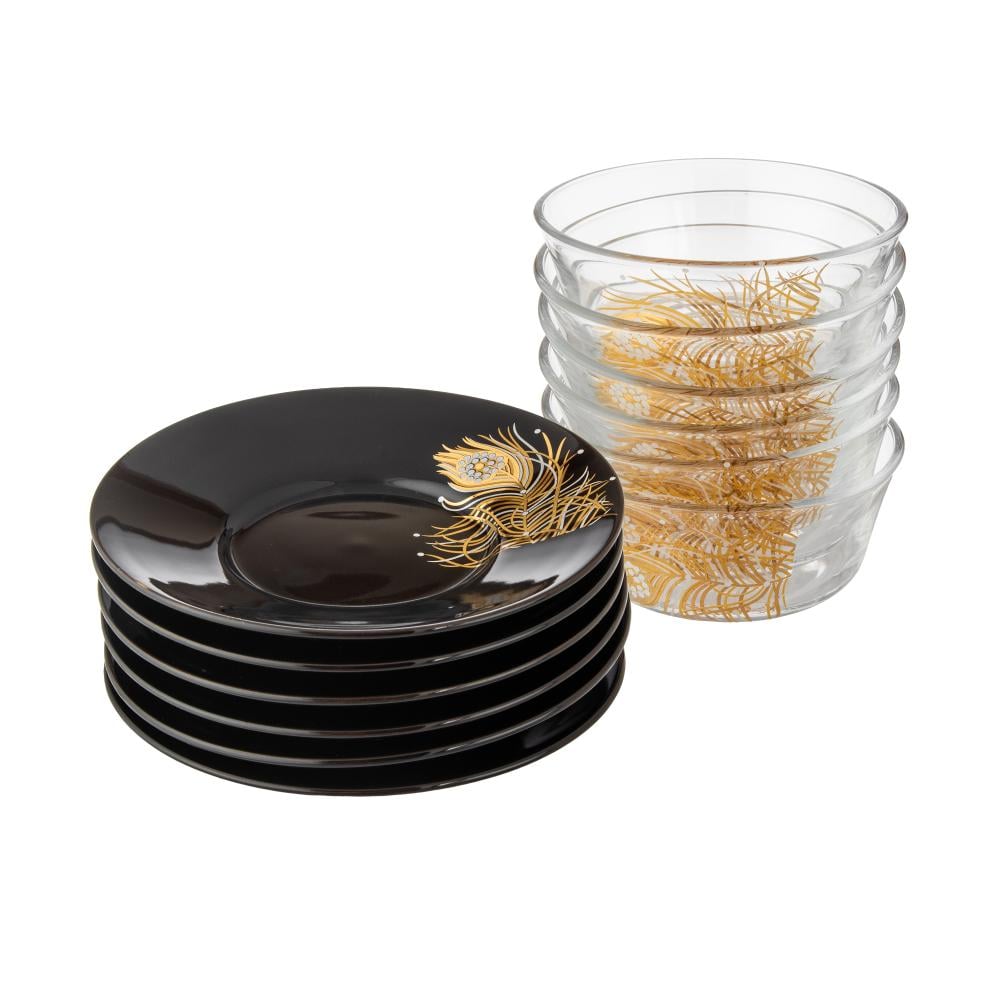 طقم زبادي تقديم زجاج شفاف مع صحون اسود 12 قطعة