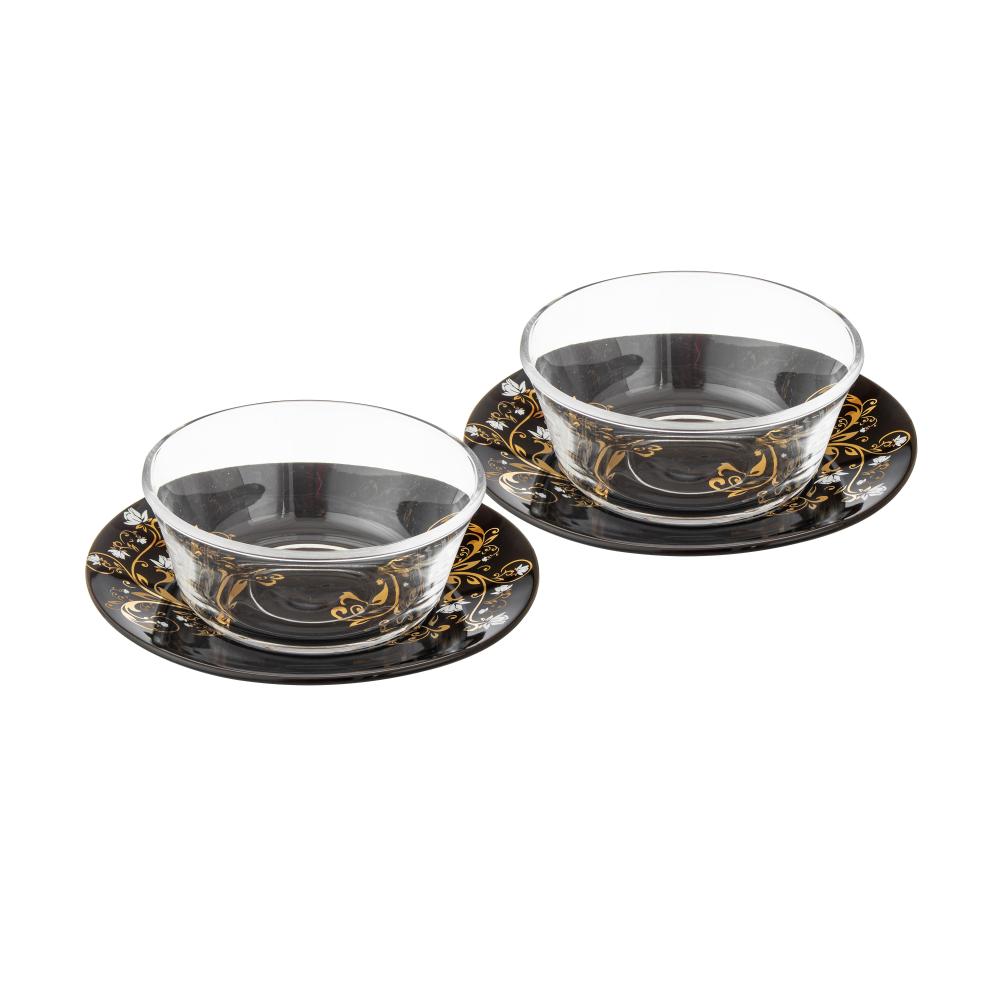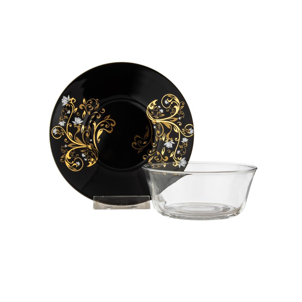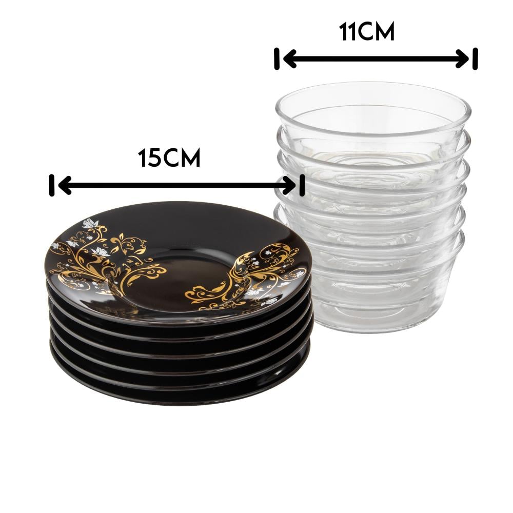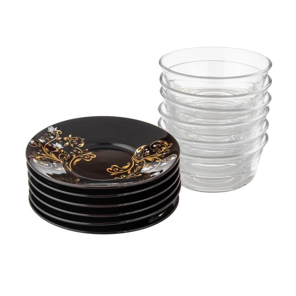 طقم زبادي زجاج شفاف مع صحن بورسلان اسود 12 قطعة مجموعة الياسمين