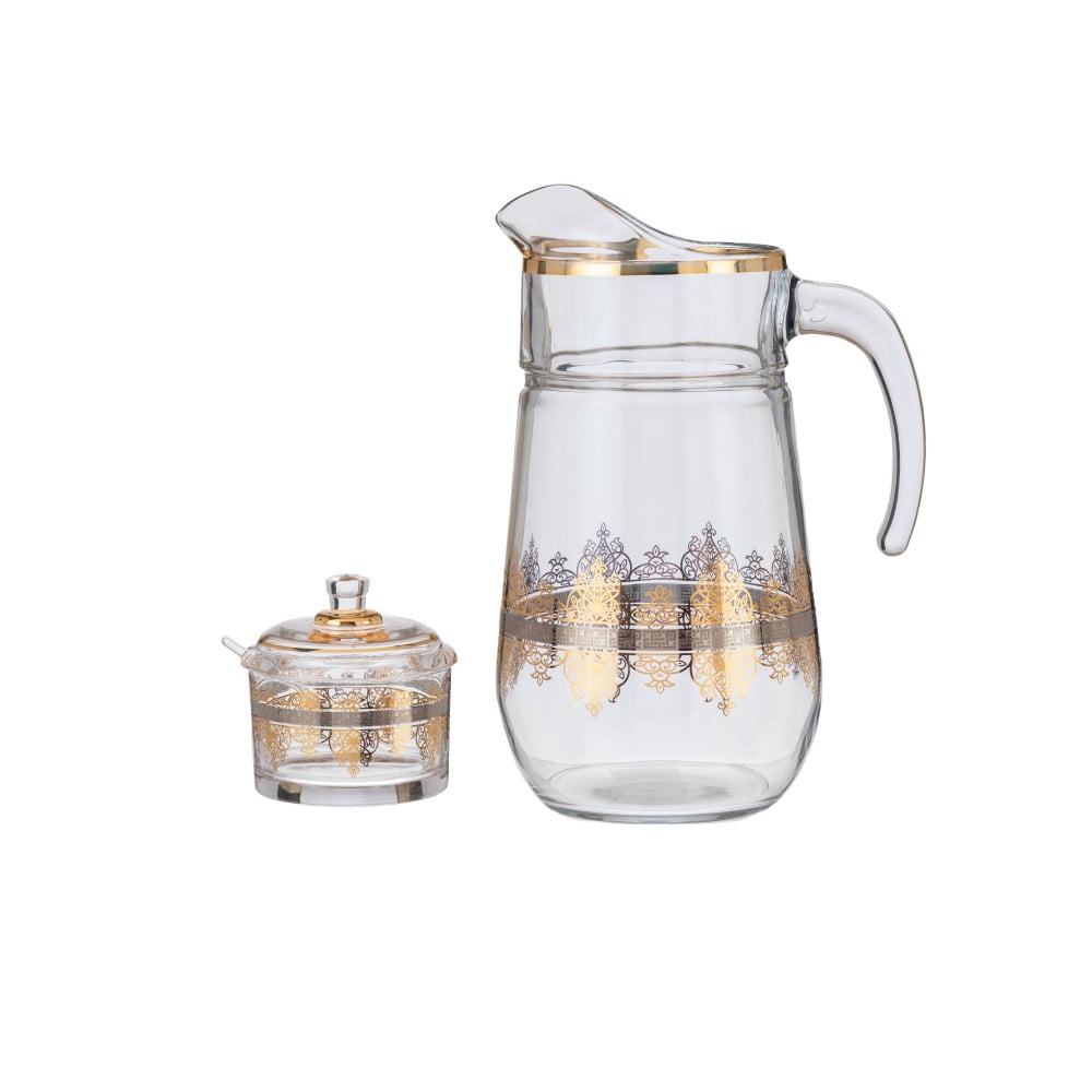 يتميز الطقم بتصميم فريد وأنيق يضفي لمسة من الجمال والفخامة على أي مناسبة، سواء كانت حفلة زفاف أو عشاء عمل أو اجتماع عائلي. فهو يحتوي على جميع الأدوات اللازمة لتقديم مشروبات ساخنة أو باردة، مثل العصير والماء والشاي والقهوة.