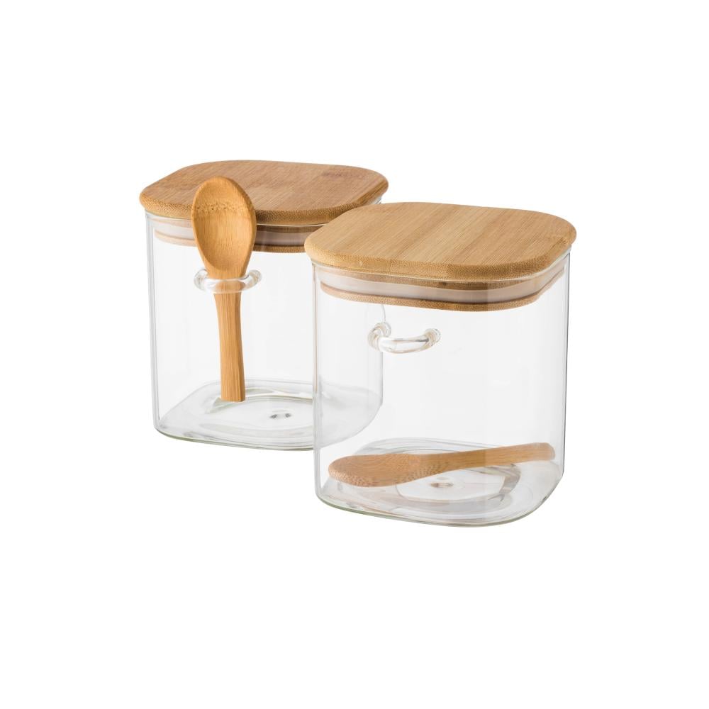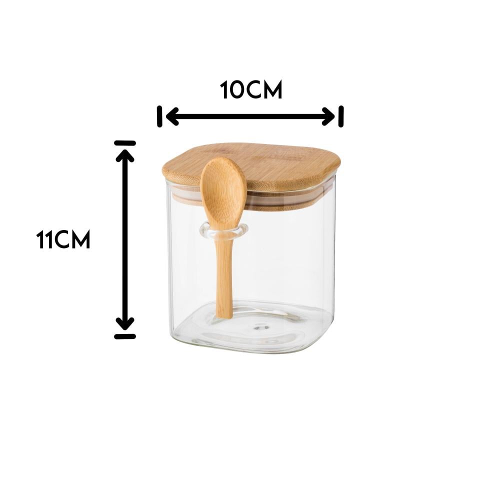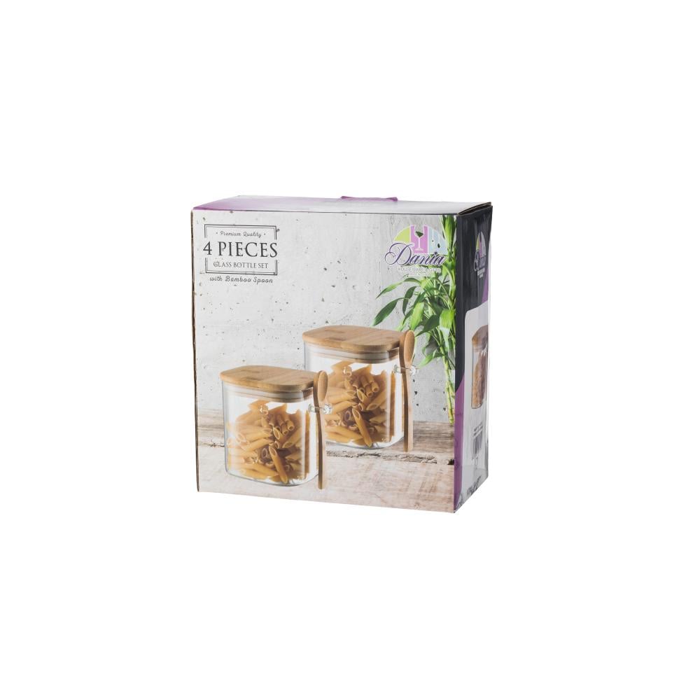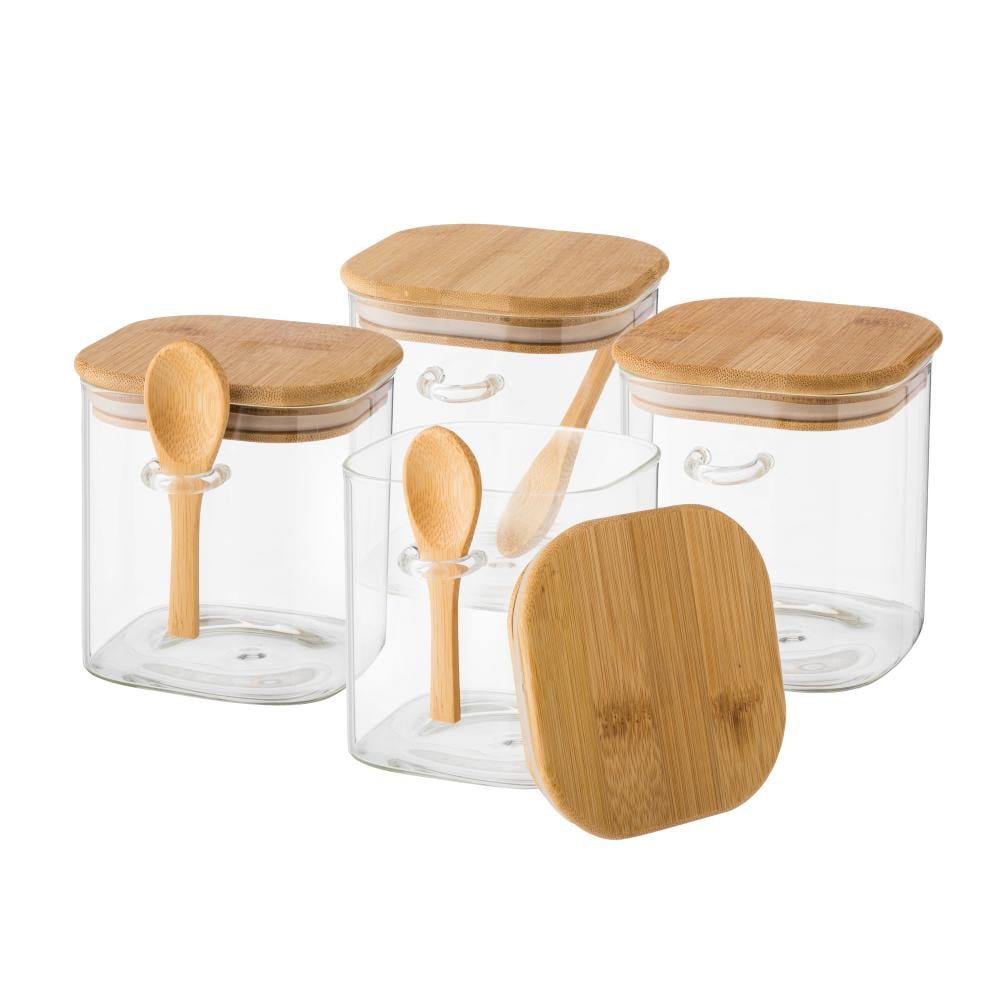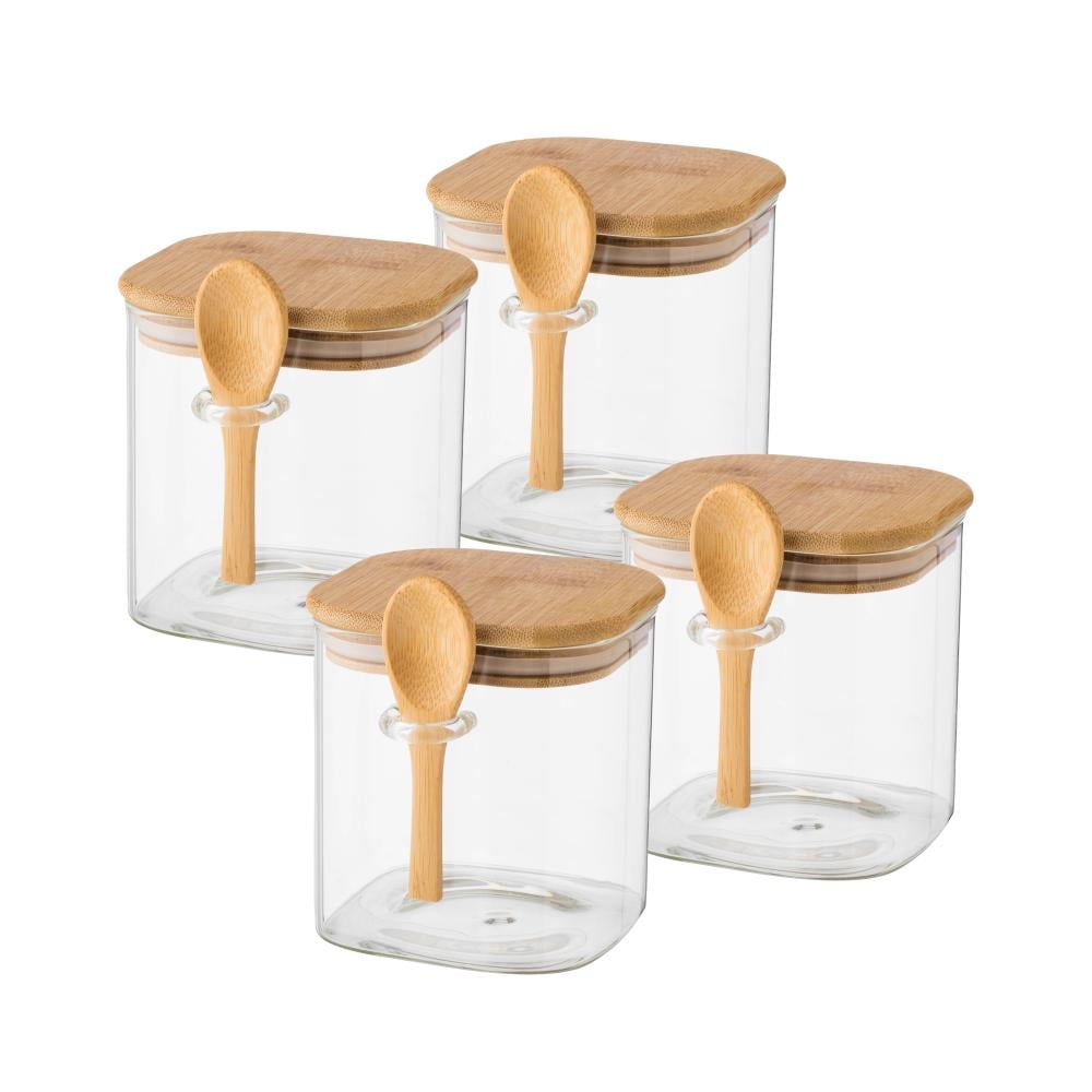 طقم علب بهارات زجاج بغطاء خشب 4 قطعة وملاعق