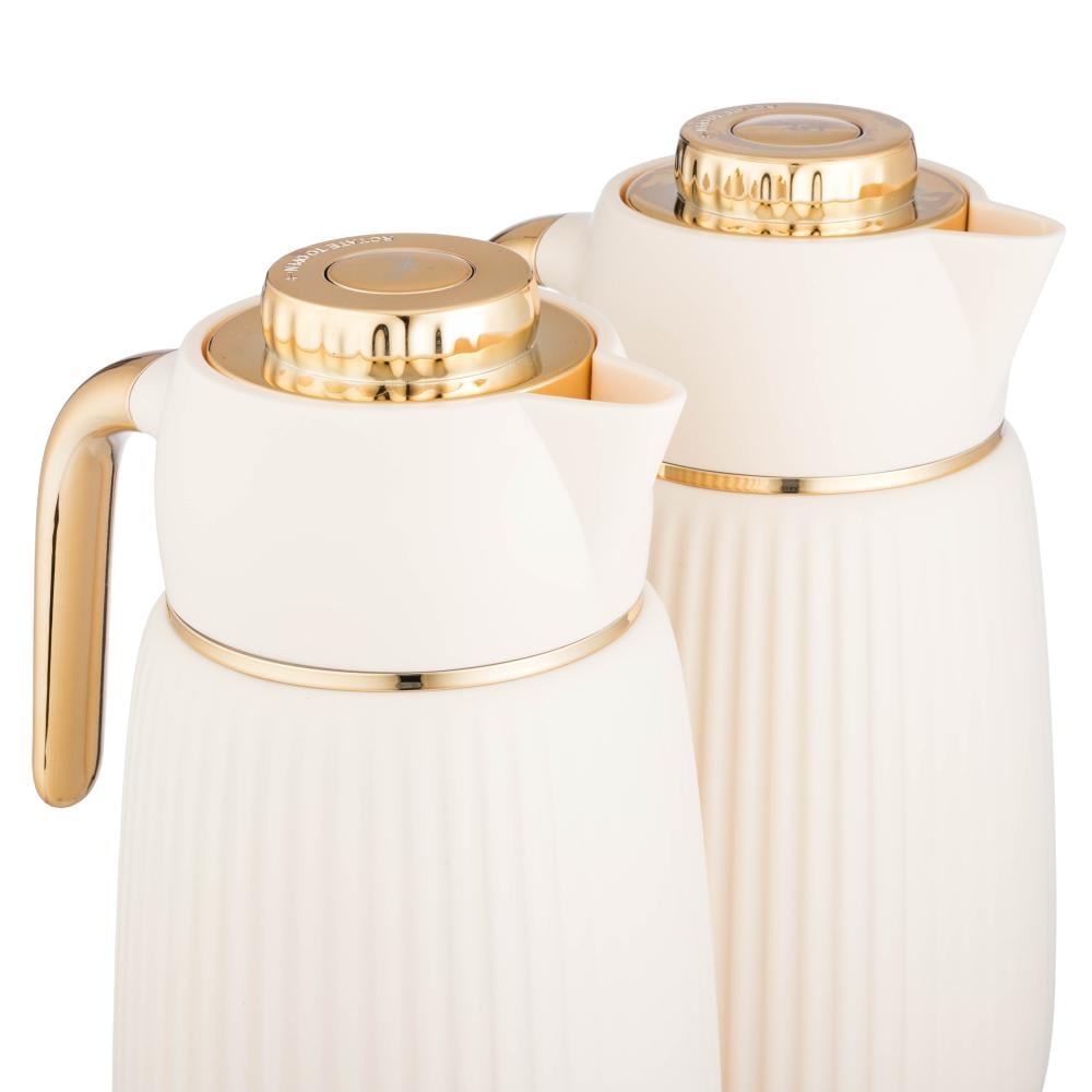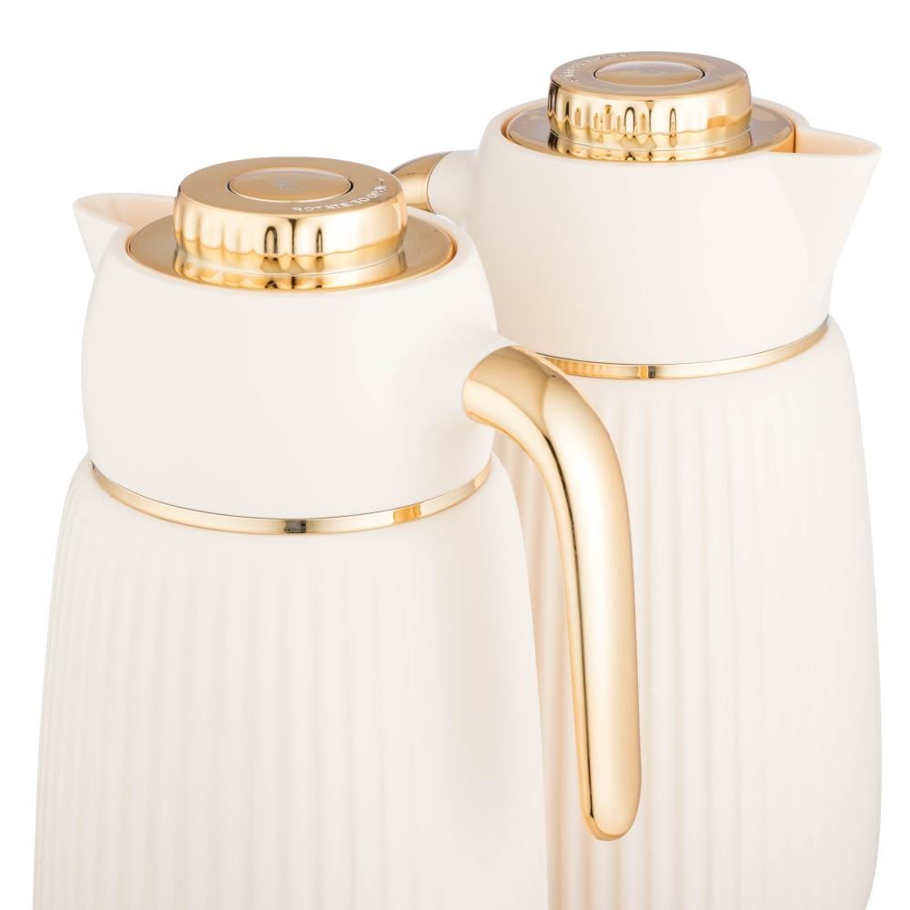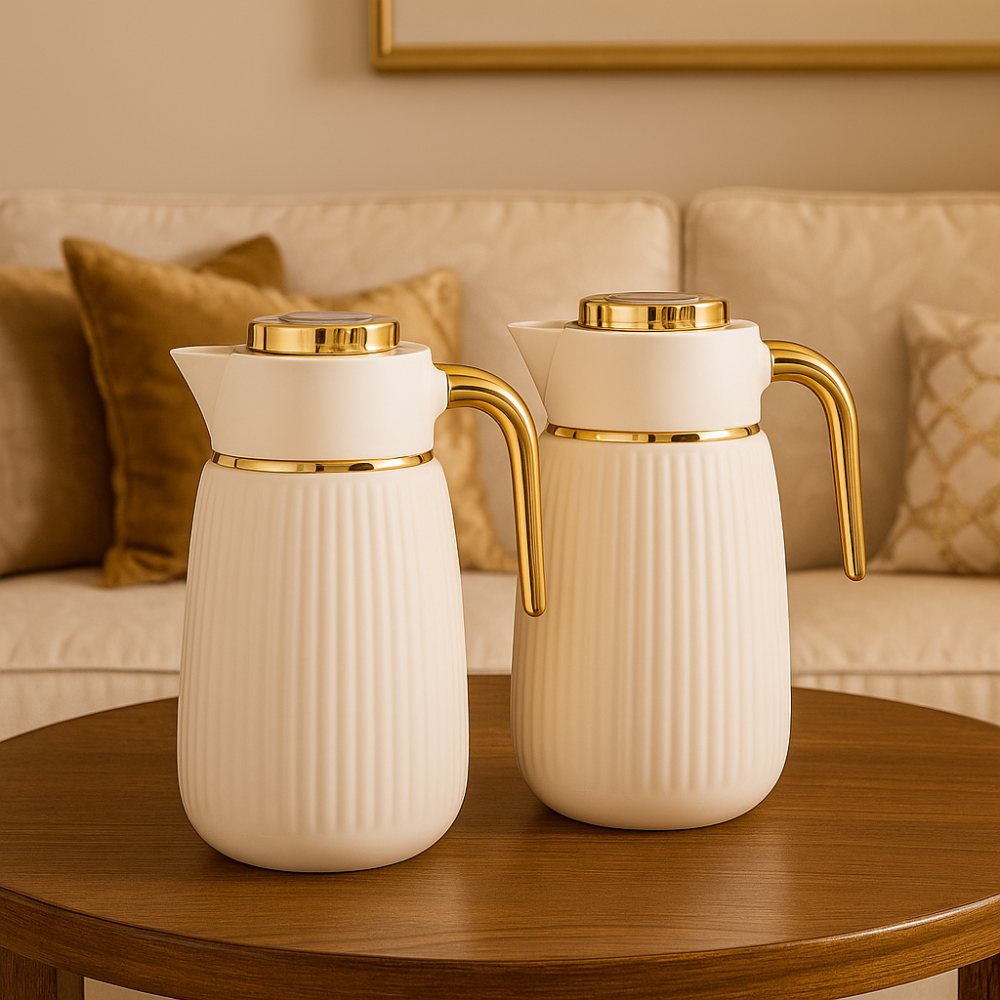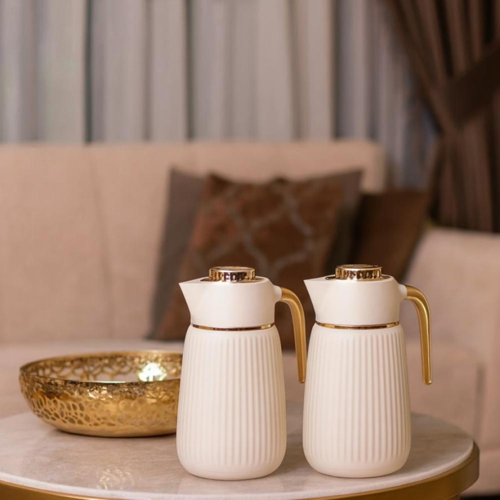 ✨ لمسة فخامة في كل ضيافةامنحي جلساتك لمسة من الأناقة مع طقم ترامس لالوزا اللؤلؤي المخطط بتصميمه العصري ولمساته الذهبية الفاخرة التي تضيف سحرًا راقياً على كل مجلس 🤍