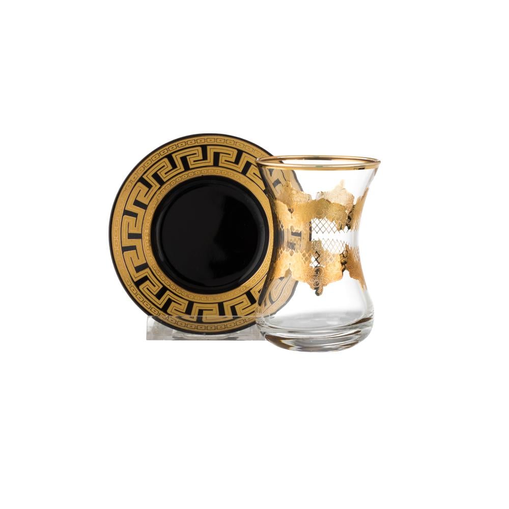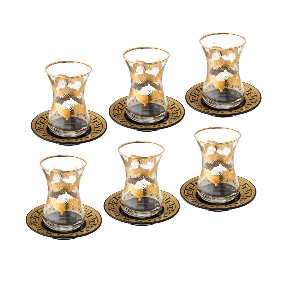 طقم كاسات شاي زجاج تركي مزخرف ذهبي مع اطباق باللون الاسود المكونات 6 كاسات شاي زجاج 6 اطباق بورسلان اسود