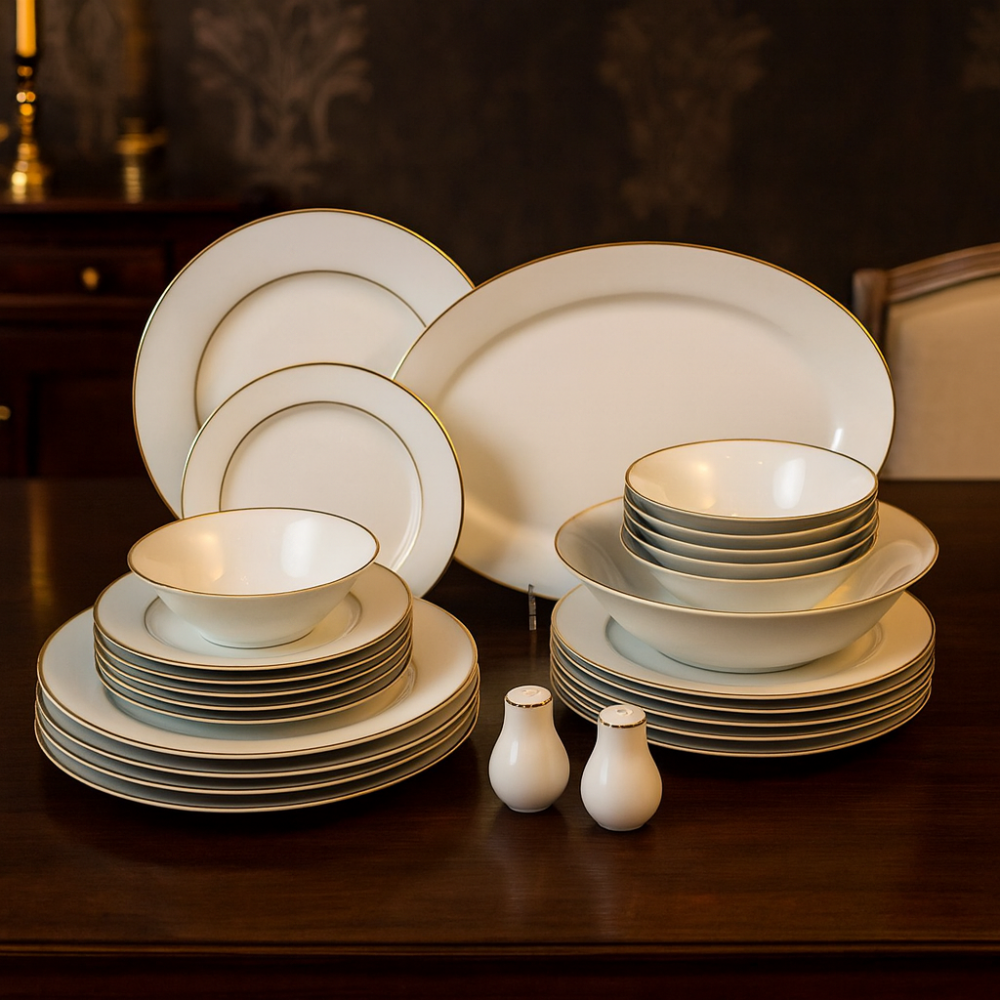 إليكم طقم السفرة الأبيض بخط ذهبي المكون من 28 قطعة، الذي يجمع بين التصميم العصري والجودة العالية
