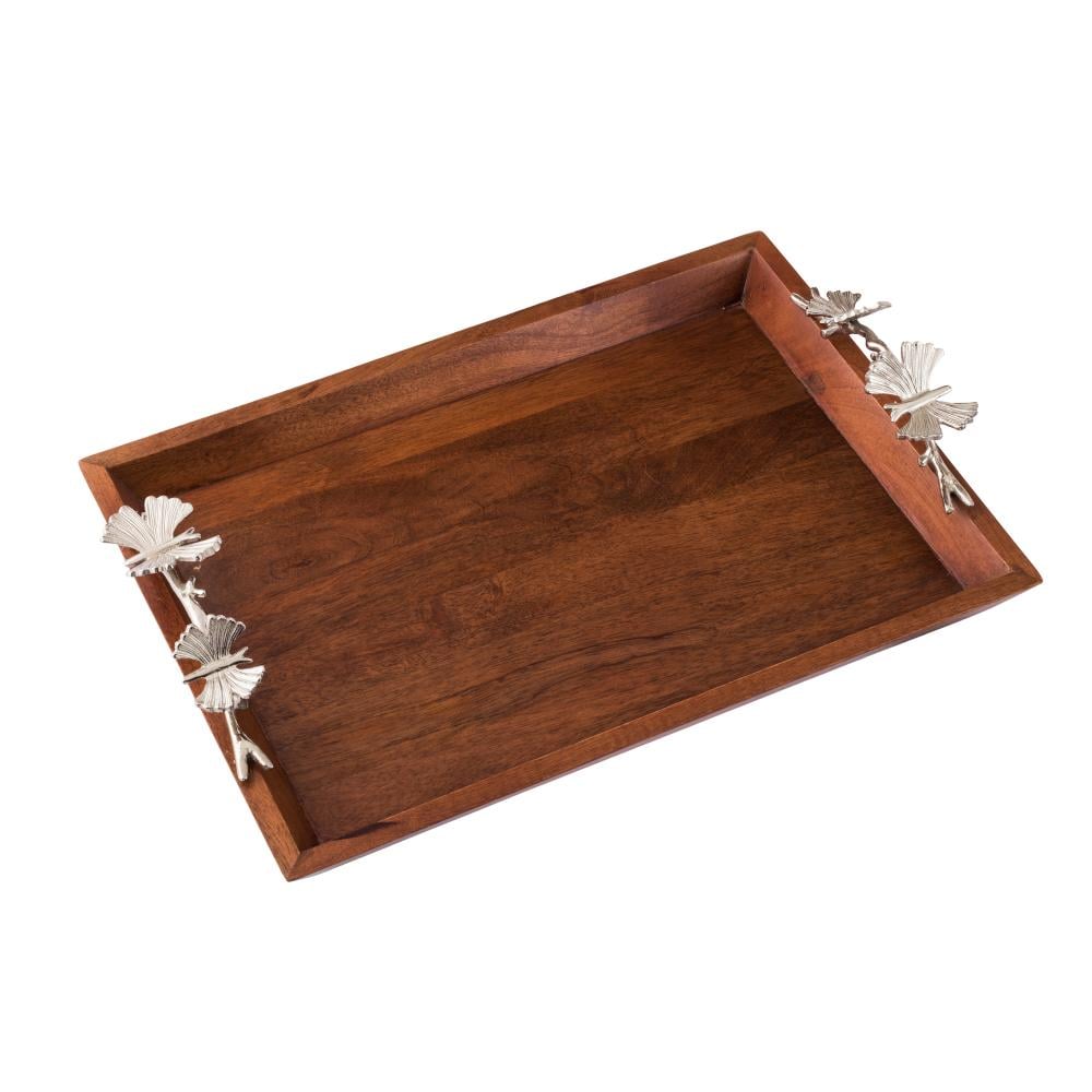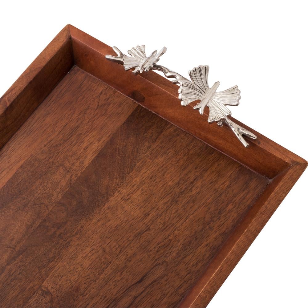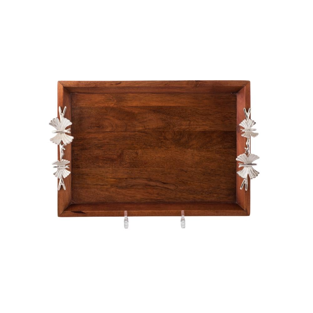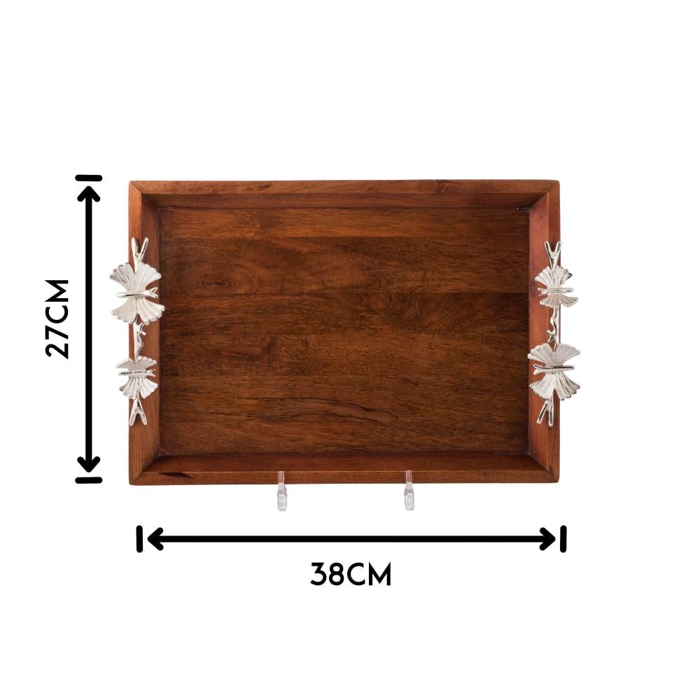 صينية تقديم خشب هندي بحامل ديكور فراشات فضي