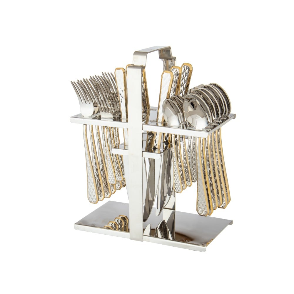 طقم ملاعق خدمة 30 قطعة استيل وذهبيالمكـــــــــــــــــــــــــونات 6 قطعة ملاعق اكل 6 قطعة شوكة اكل 6 قطعة ملاعق حلا6 قطعة شوكة حلا6 طقعة سكاكين اكل استاند معدن