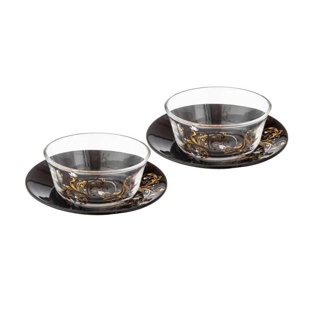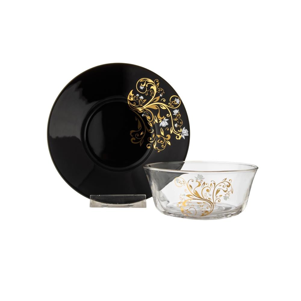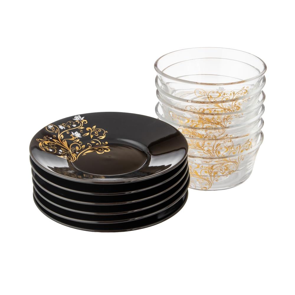 طقم زبادي زجاج شفاف مع صحن بورسلان اسود 12 قطعة مجموعة الياسمين