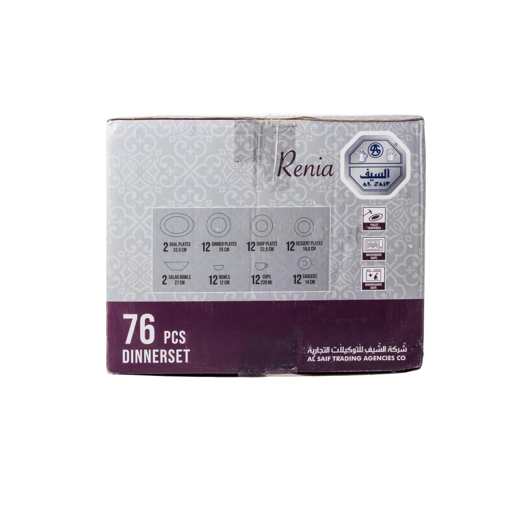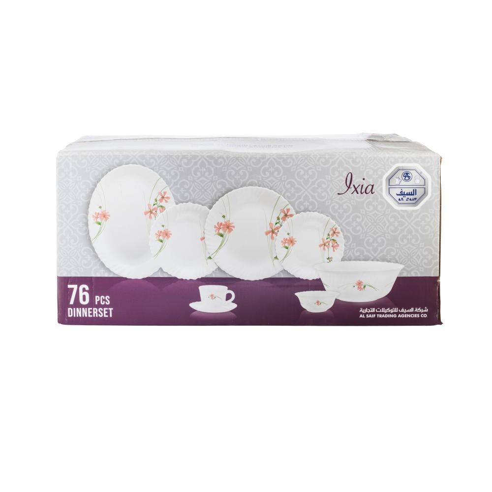 استمتعي بأجواء المائدة الأنيقة مع هذا الطقم المتكامل المكون من 76 قطعة ليكفي حتى 12 شخص، بتصميم عصري مزين بنقوش زهور ملونة تضيف لمسة من البهجة والفخامة إلى سفرتك.
