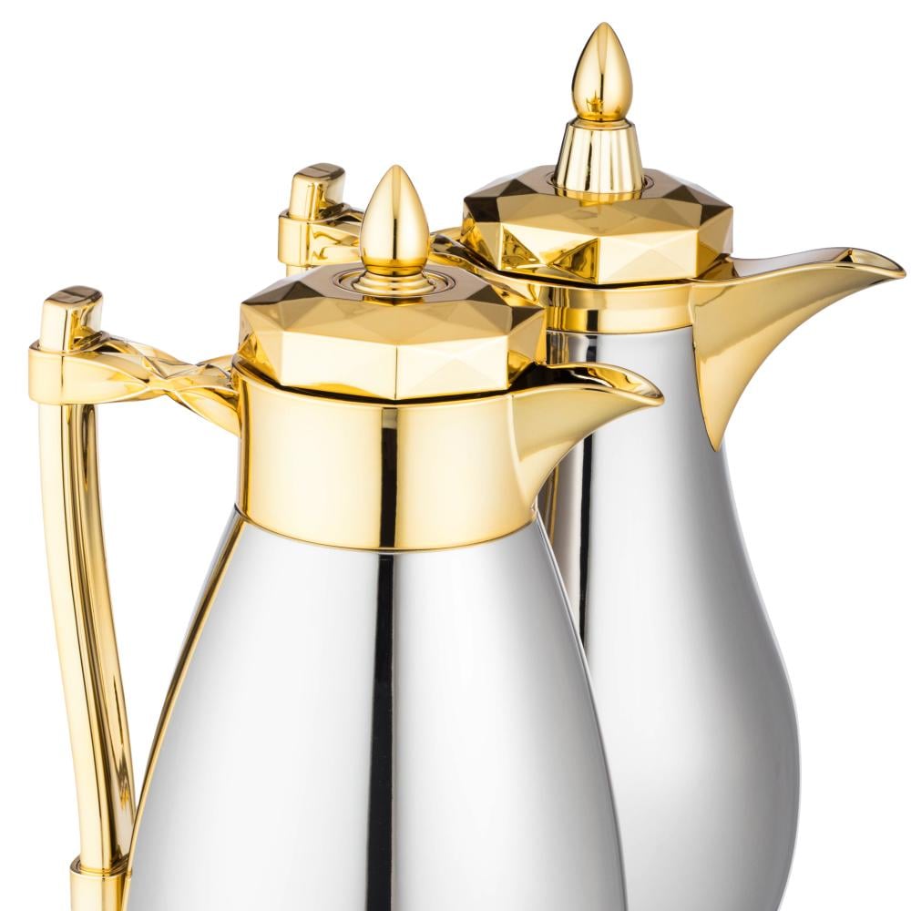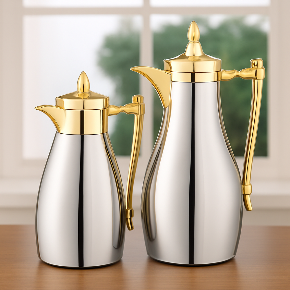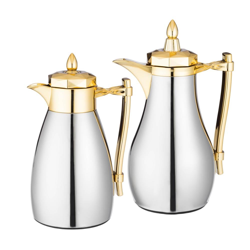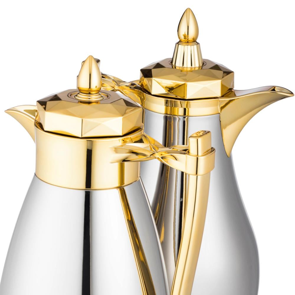 استمتع بأجواء الضيافة الفاخرة مع طقم ترامس الدانة المميز، المكون من قطعتين بتصميم يجمع بين النيكل الفضي واللون الذهبي الراقي