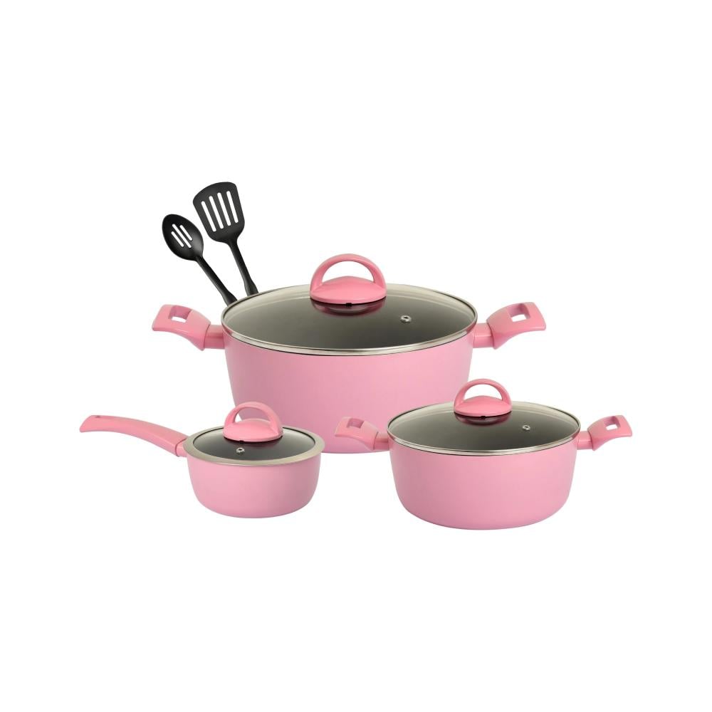 طقم نيوفلون روز قدر مقاس 20-24 سم بغطاء زجاج كسرولة مقاس 16 سم بغطاء زجاج 2 ملاعق طبخلون وردي من الخارجبغطاء زجاج عصري