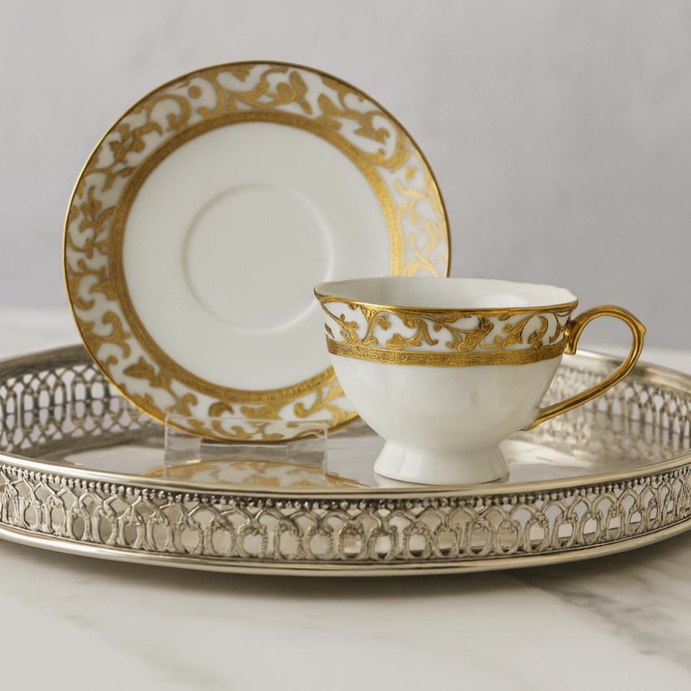 استمتع بلحظات الشاي الأنيقة مع هذا الفنجان البورسلان الفاخر بتصميمه الكلاسيكي الراقي ولمساته الذهبية اللامعة. يجمع بين البساطة والفخامة ليمنحك تجربة تقديم راقية تضيف لمسة من الذوق الملكي إلى طاولتك.