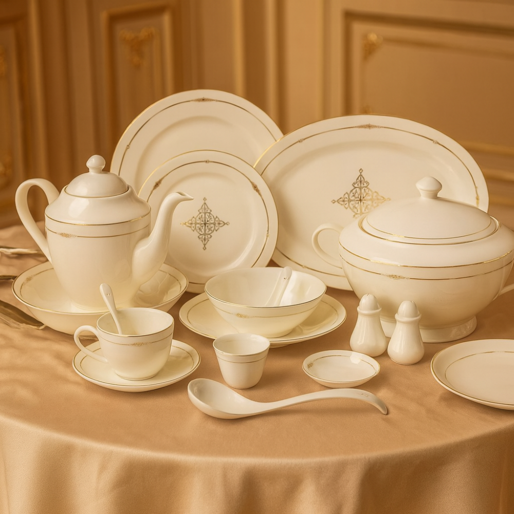 استمتع بأجواء فاخرة على مائدتك مع هذا الطقم البورسلاني الأبيض المزخرف بخطوط ذهبية أنيقة تضفي لمسة من الرقي على كل وجبة.