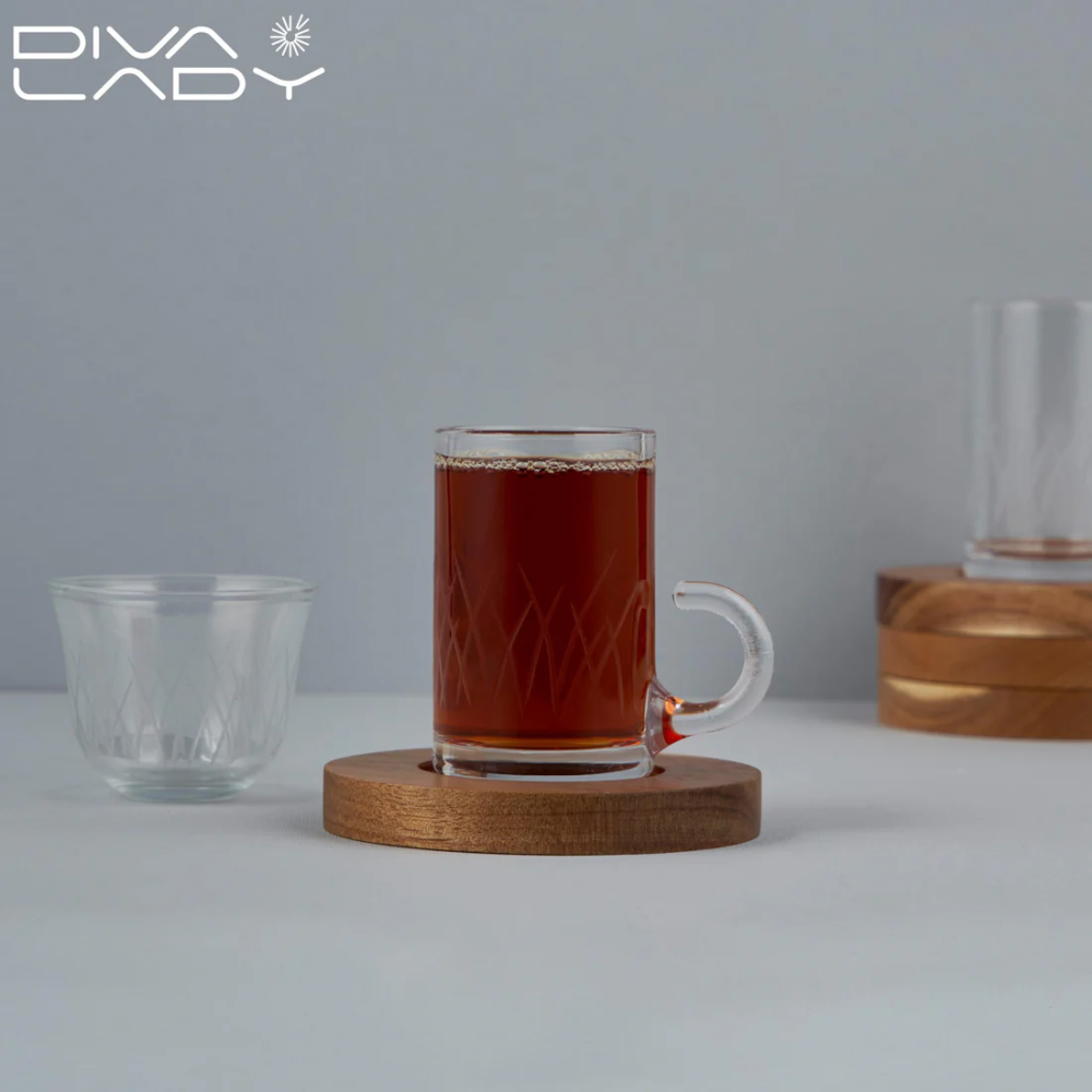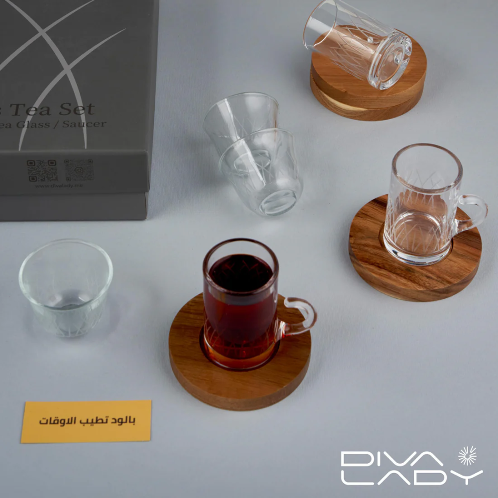 طقم فناجين شاي وقهوة زجاج منقوش 18 قطعة بصحن خشب فاخر 6 اشخاص ديفاليدي